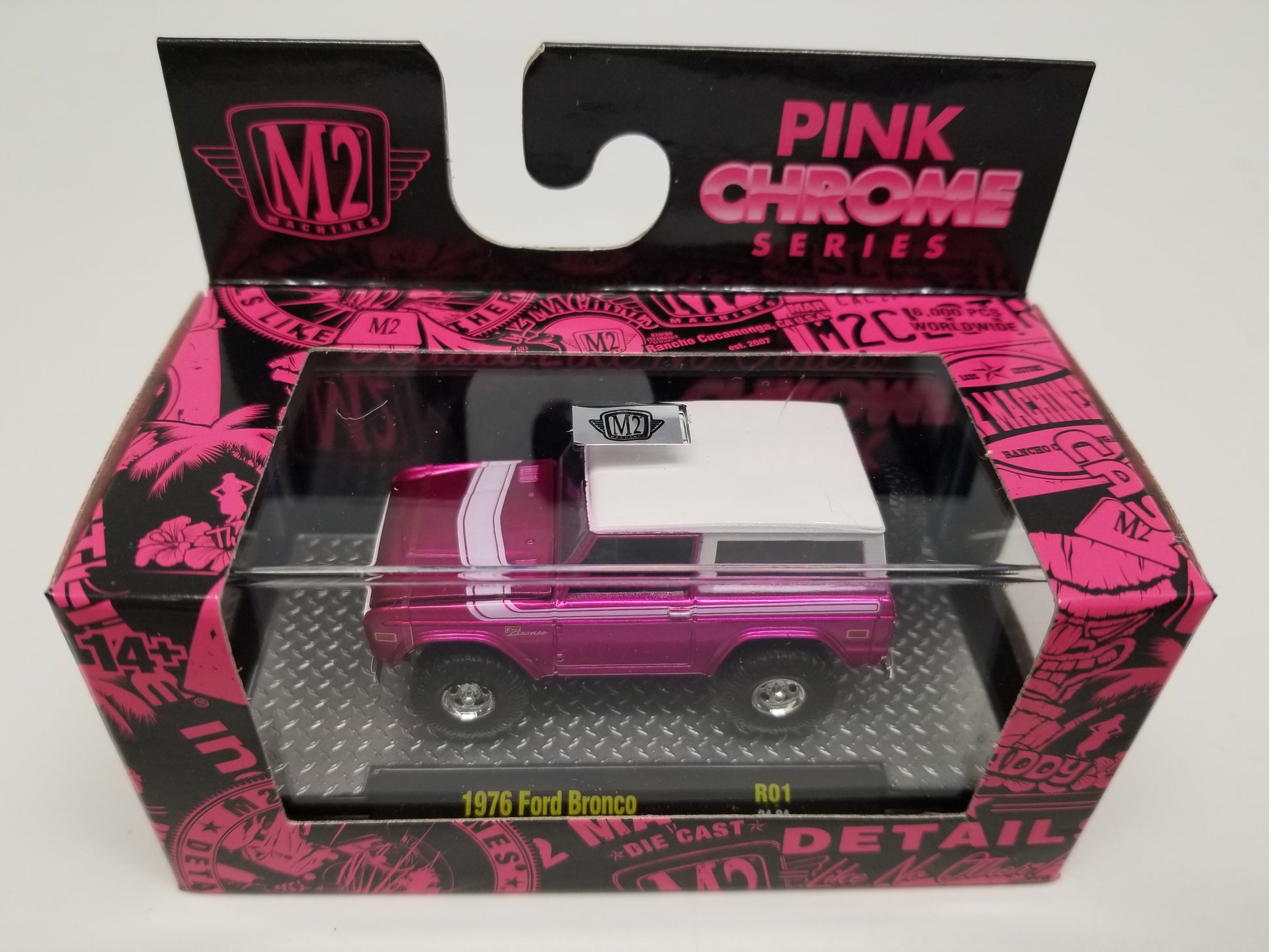 M2 1976 Ford Bronco - Pink Chrome. New in package, 1:64 scale.