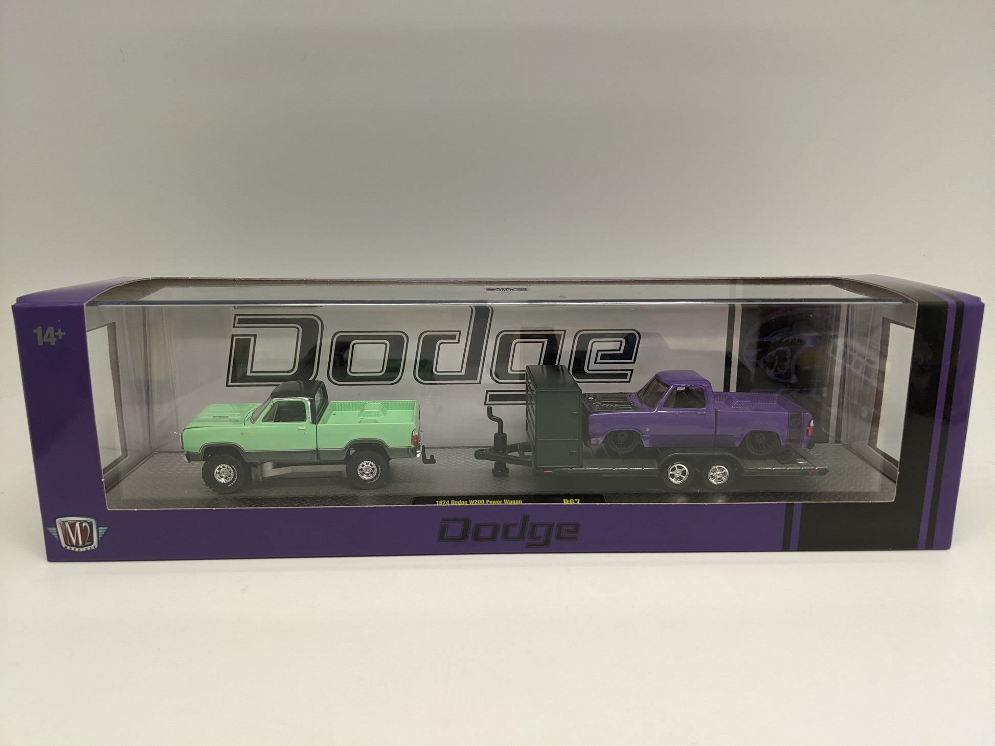 M2 1974 Dodge W200 Power Wagon & 1978 Dodge Truck Adventure 150 Auto Hauler new in package, 1:64 scale.
