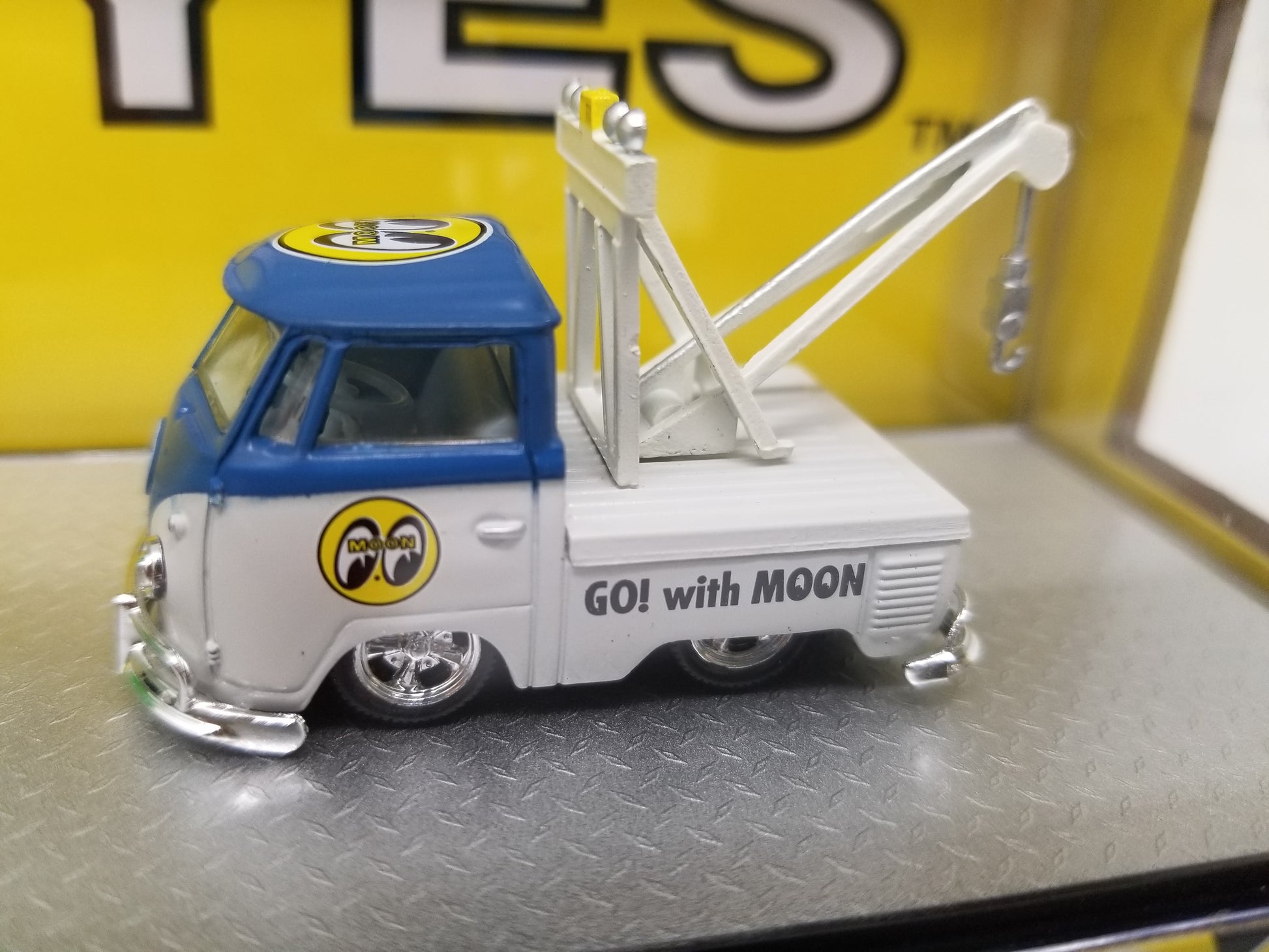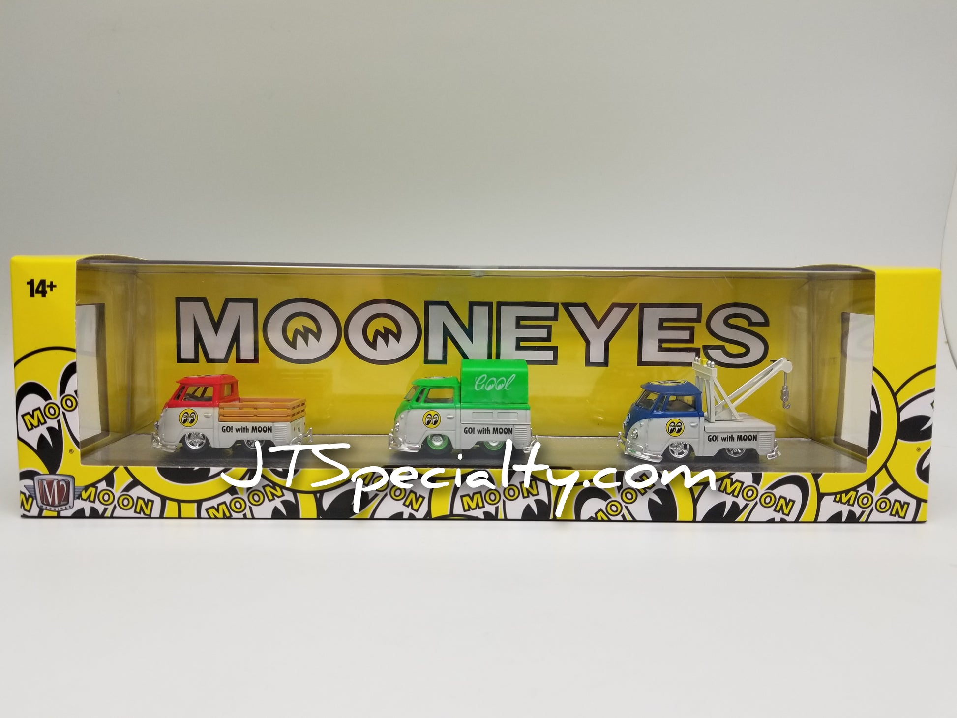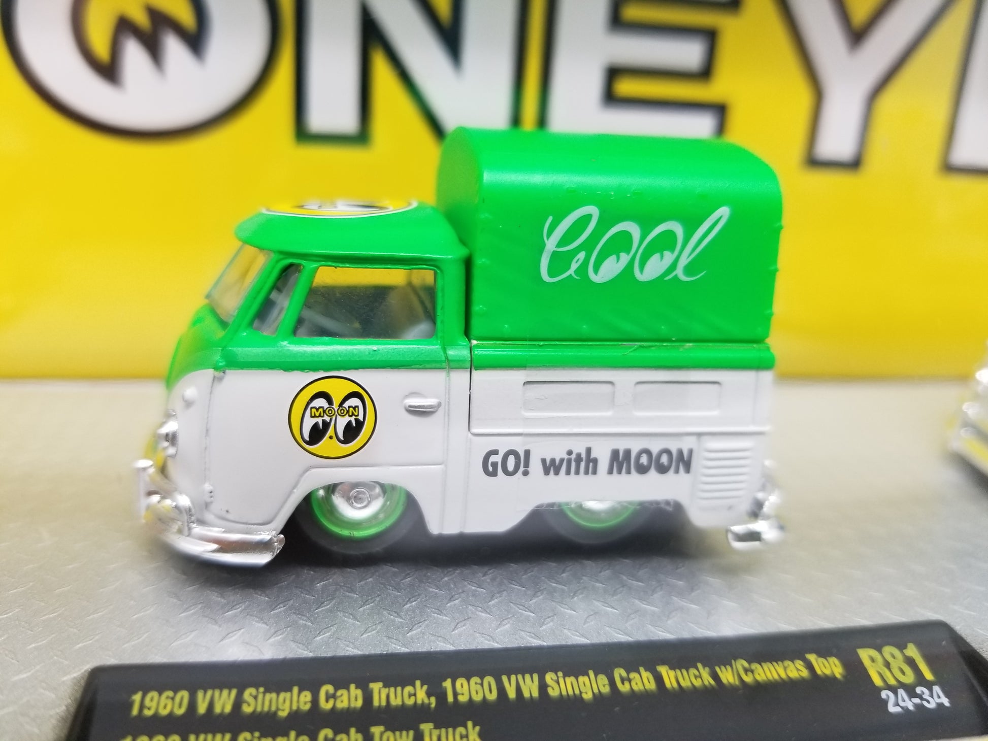 M2 1960 VW Single Cab Truck & 1960 VW Single Cab Truck w/ Canvas Top & 1960 VW Single Cab Tow Truck - Auto Hauler MOONEYES. New in package, 1:64 scale.