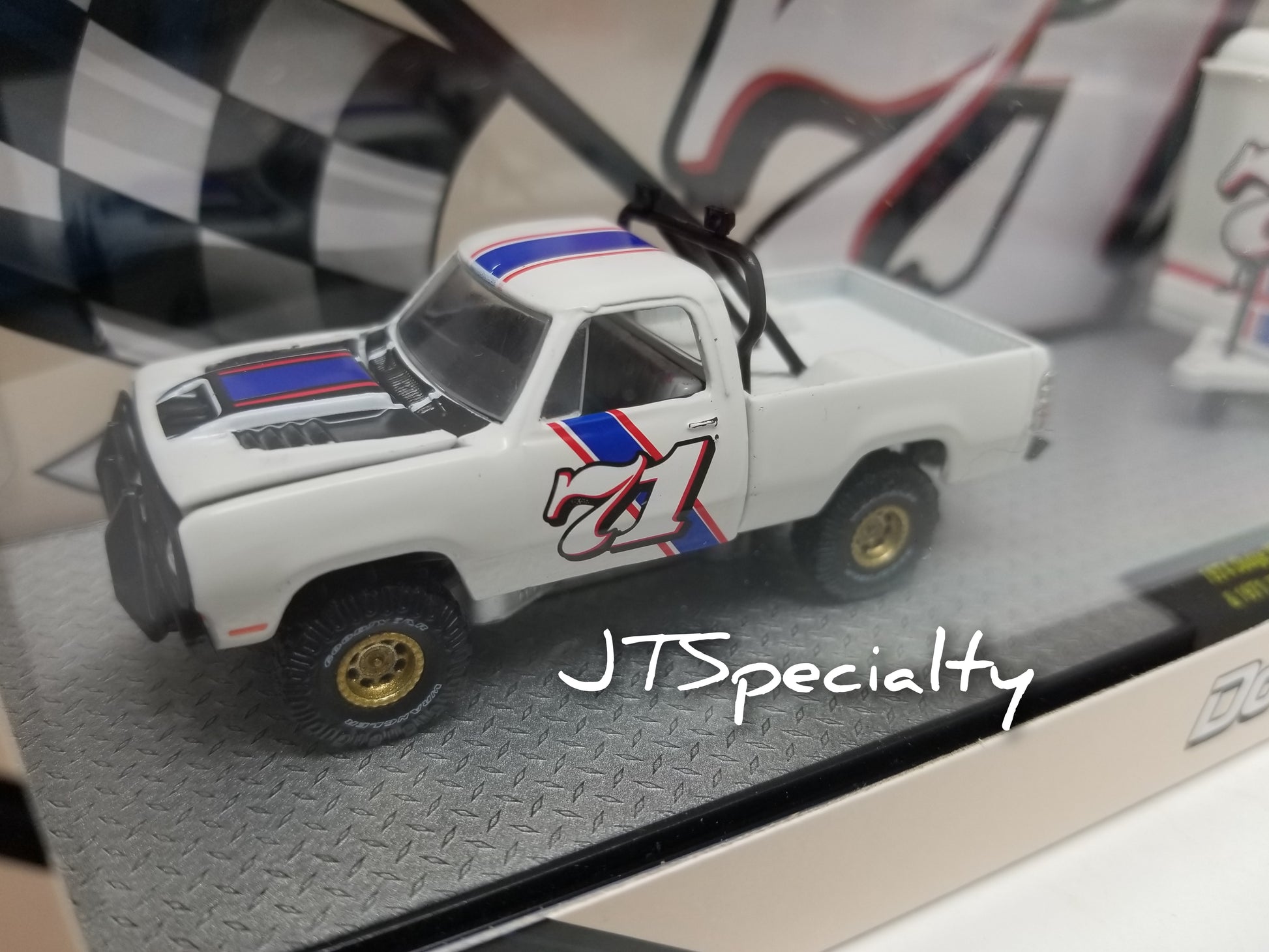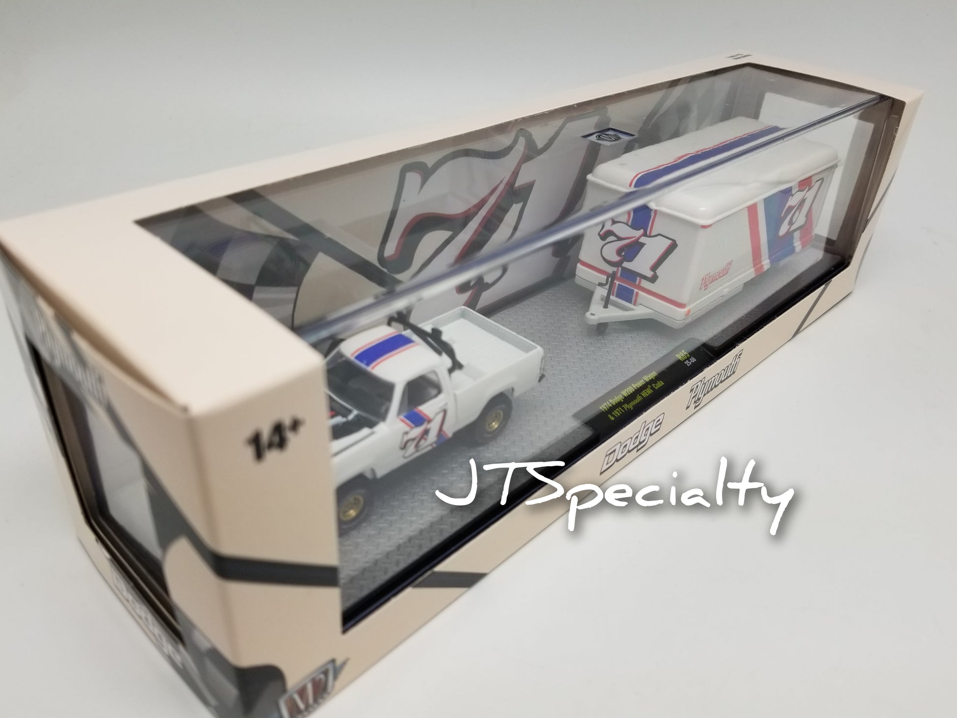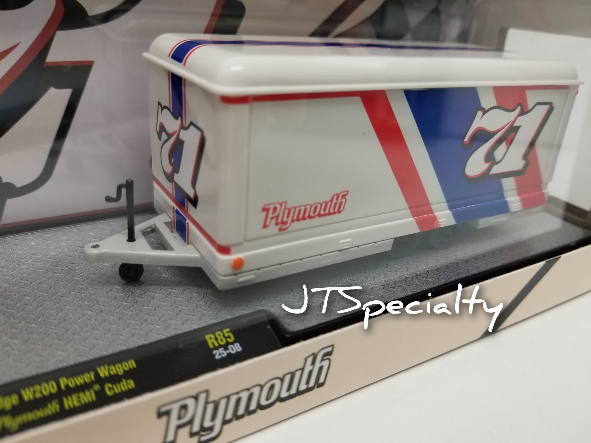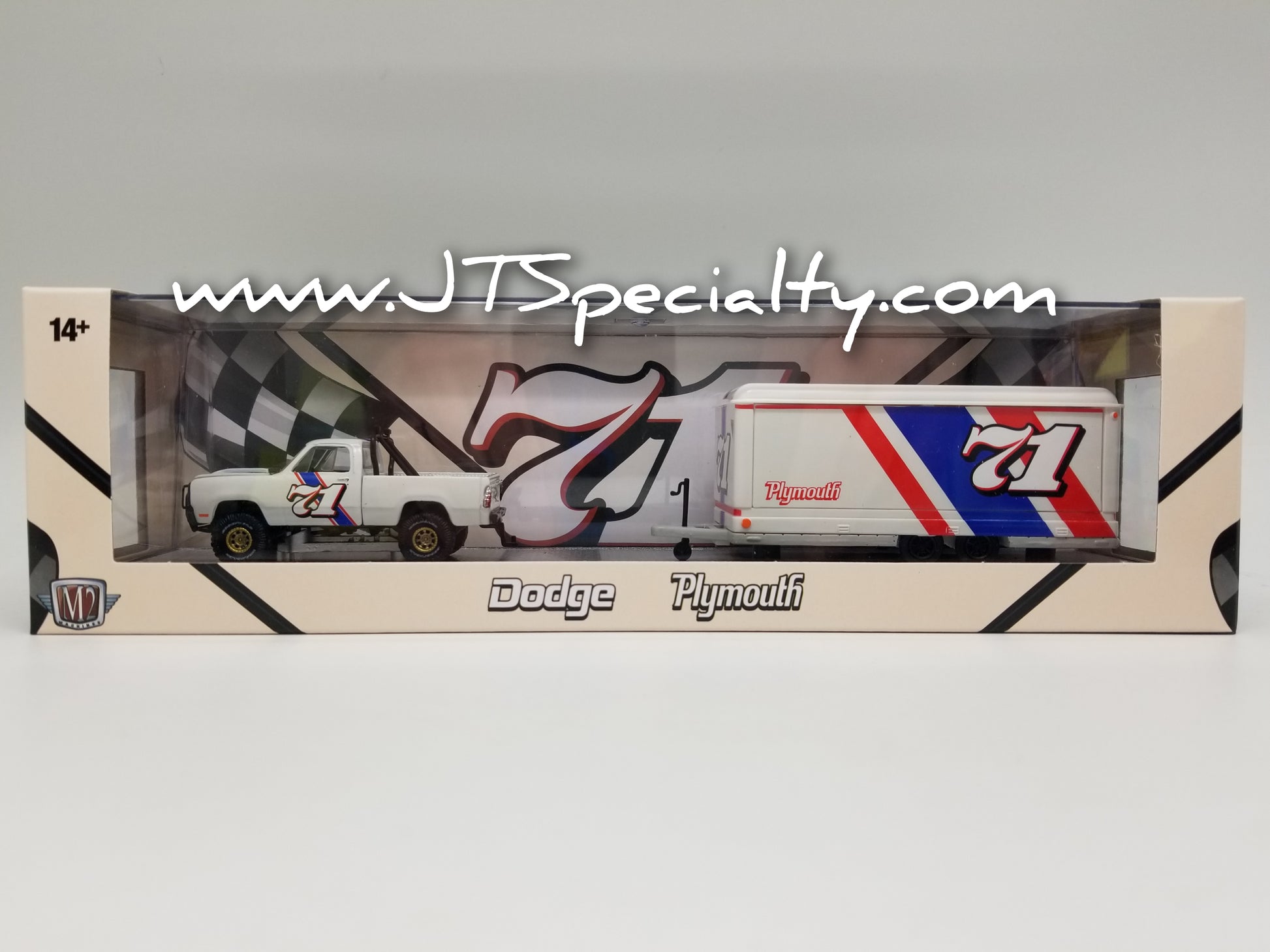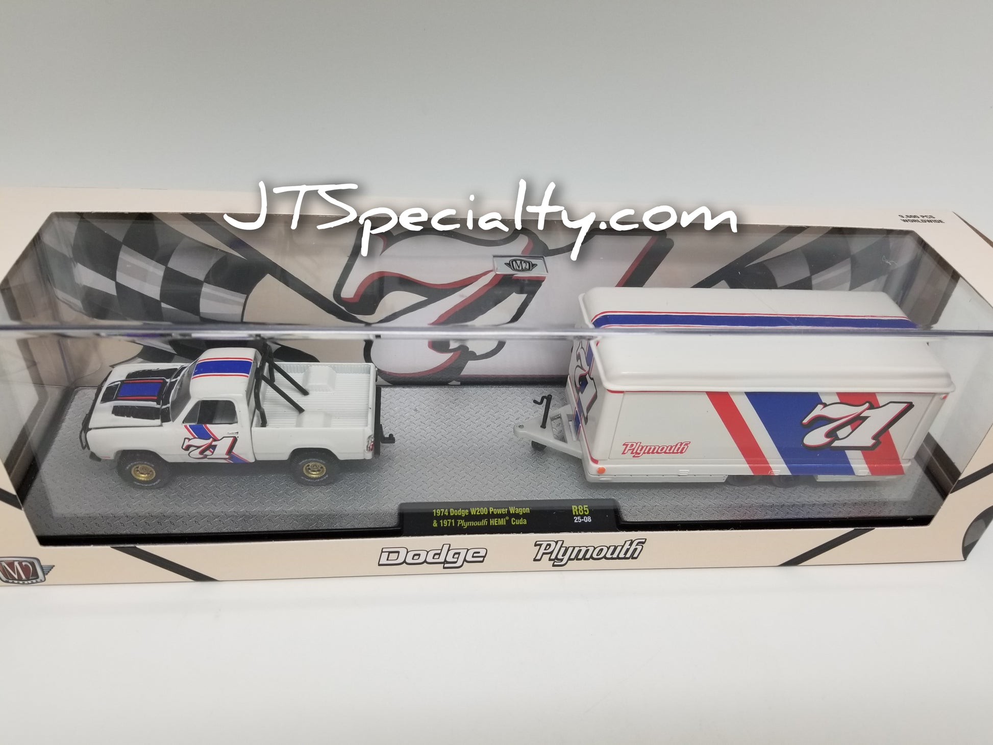 M2 1974 Dodge W200 Power Wagon & 1971 Plymouth HEMI Cuda Auto Hauler. New in package, 1:64 scale. RACE DAY