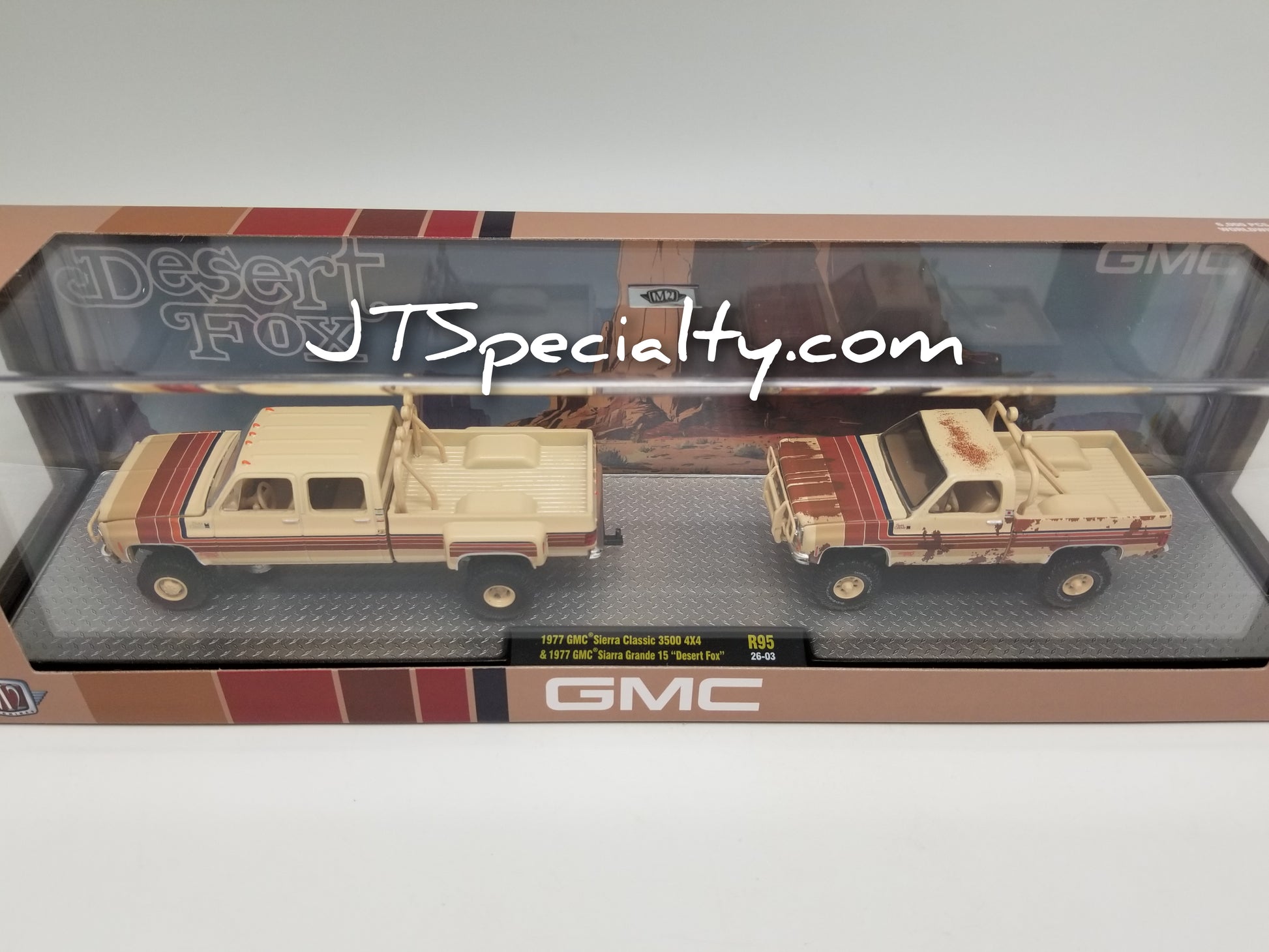 M2 1977 GMC Sierra Classic 3500 4x4 & 1977 GMC Sierra Grande 15 Desert Fox - Auto Hauler new in package, 1:64 scale.