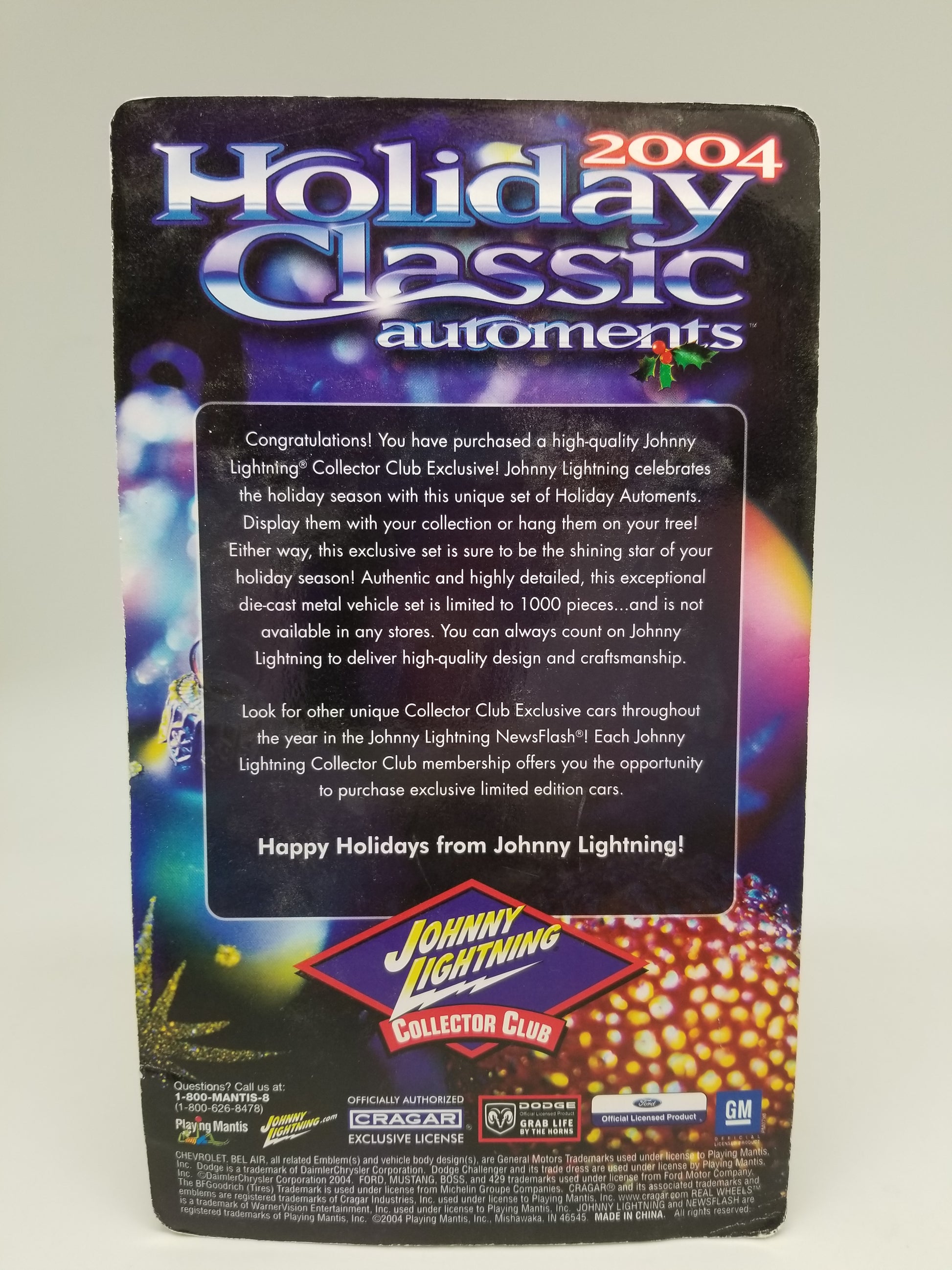 Johnny Lightning JL 1971 Dodge Challenger R/T, 1970 Mustang Boss 429, 1962 Chevy Bel-Air - 2004 Holiday Classic Automents new in package, 1:64 scale.