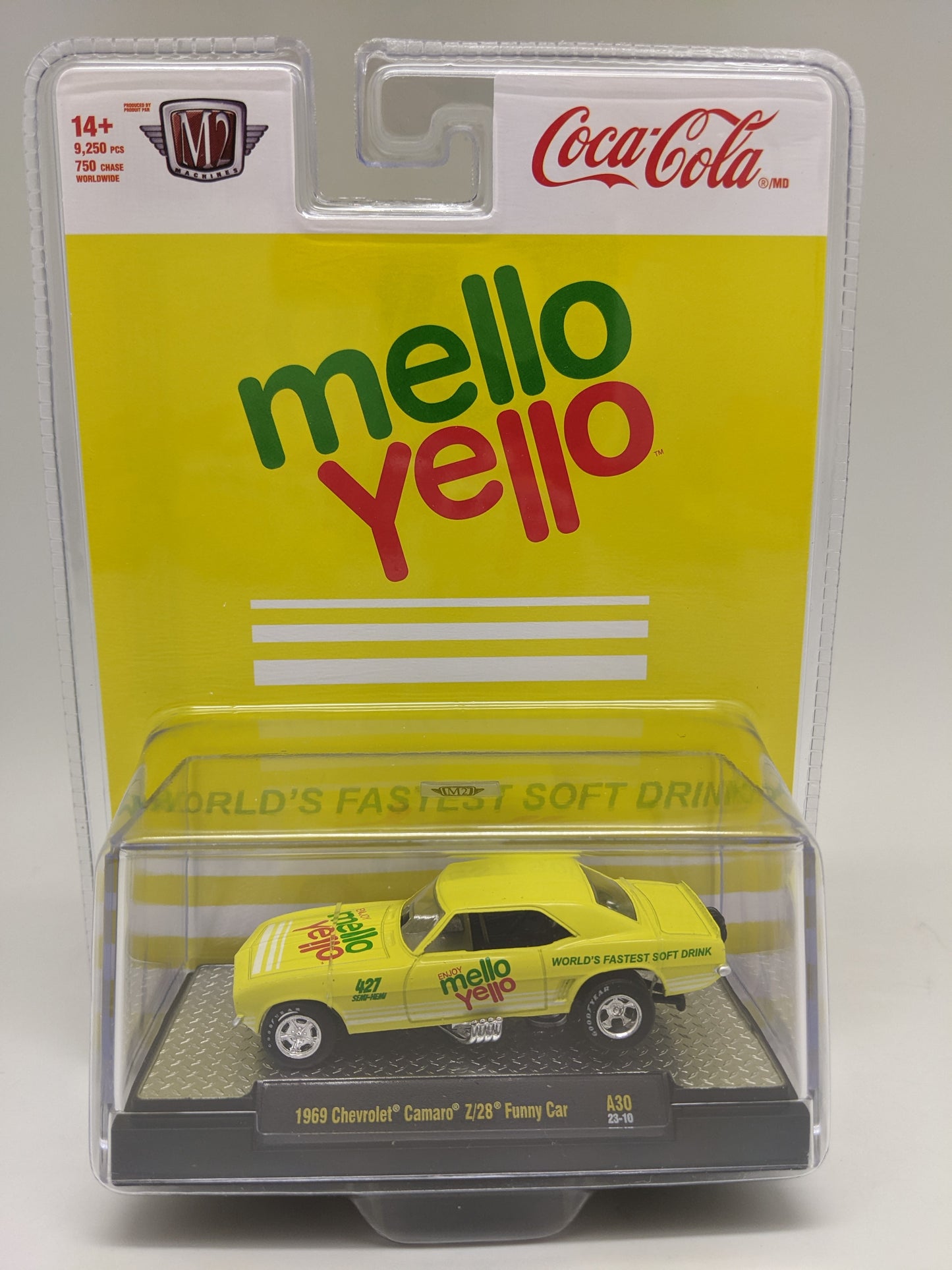 M2 1969 Chevrolet Camaro Z/28 Funny Car - Mello Yello new in package, 1:64 scale.