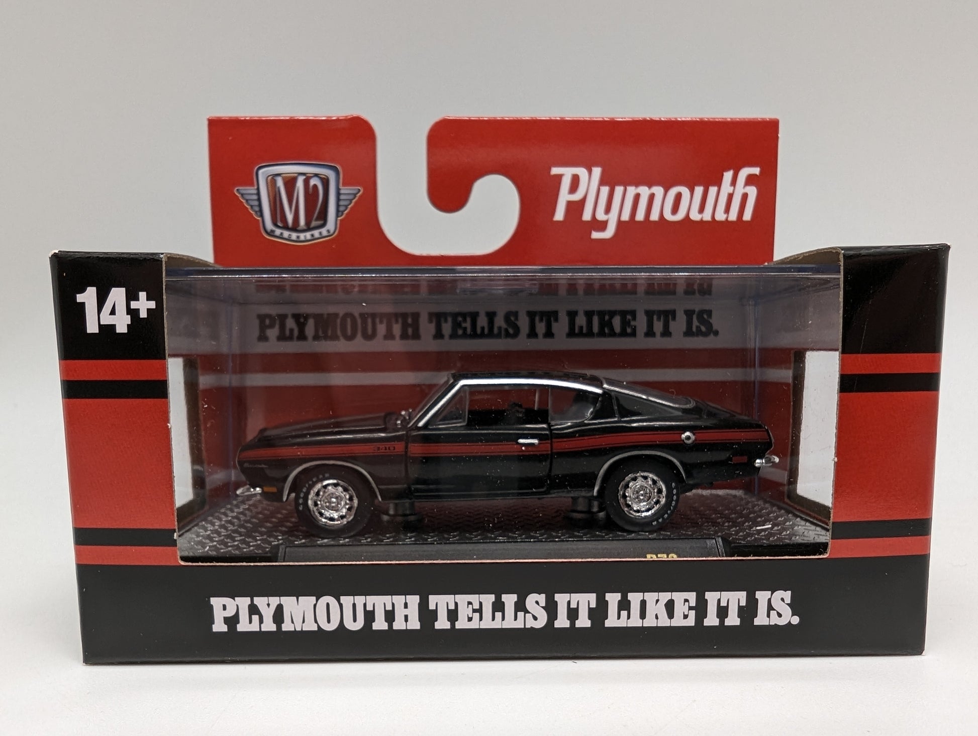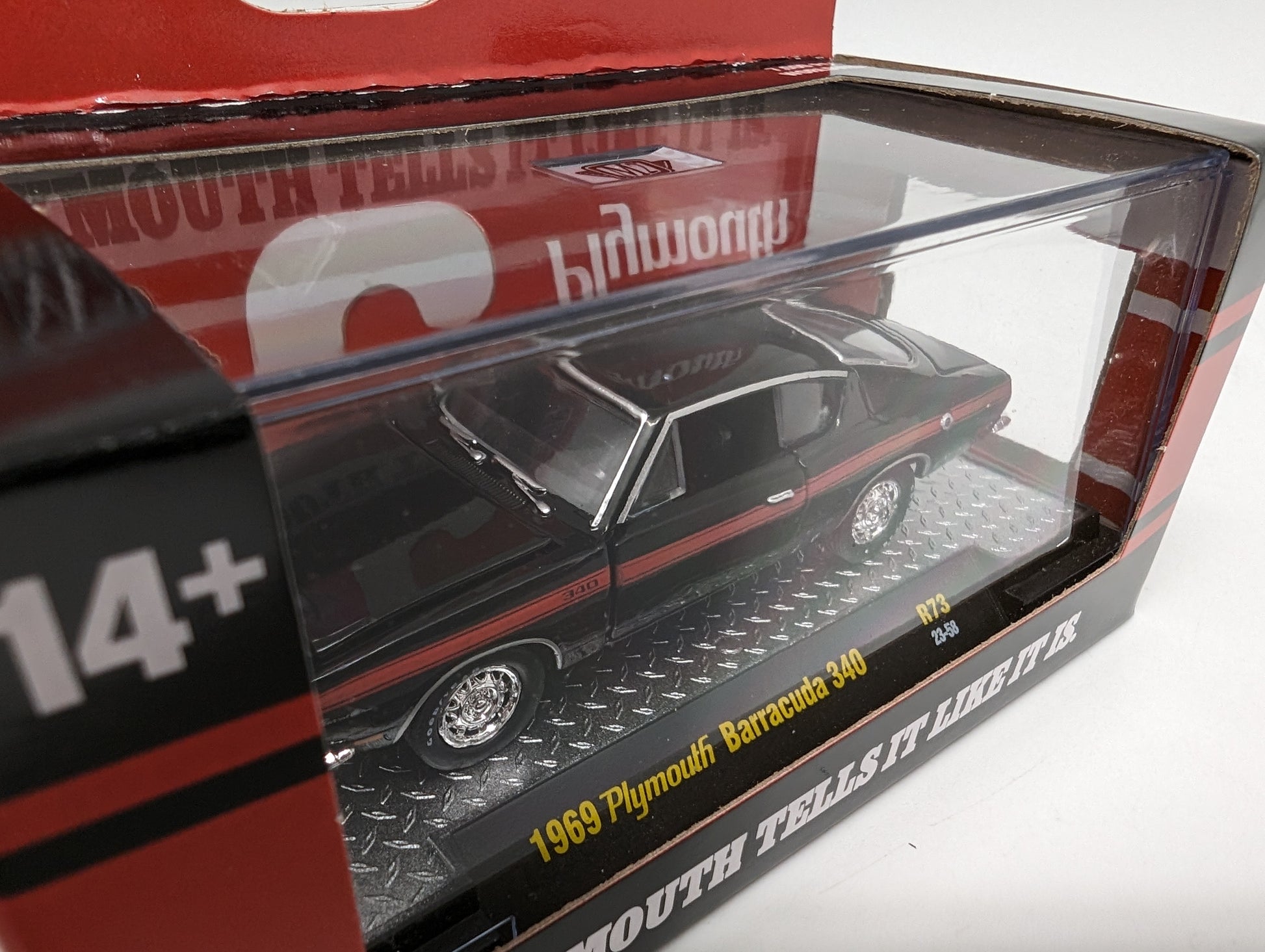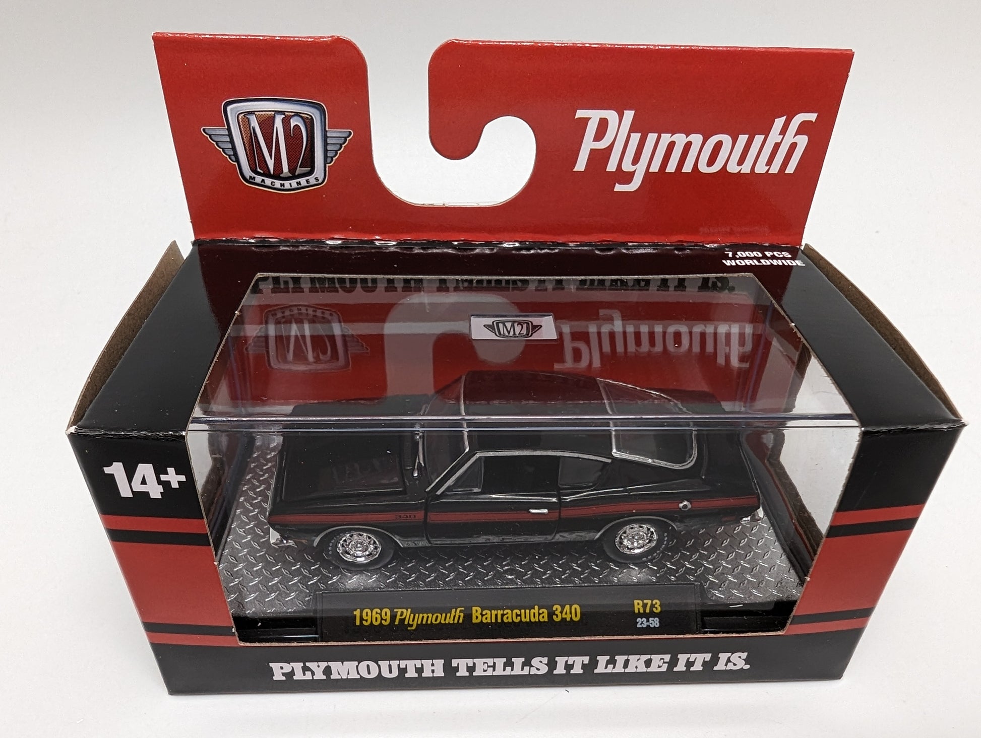 M2 1969 Plymouth Barracuda 340 new in package, 1:64 scale.