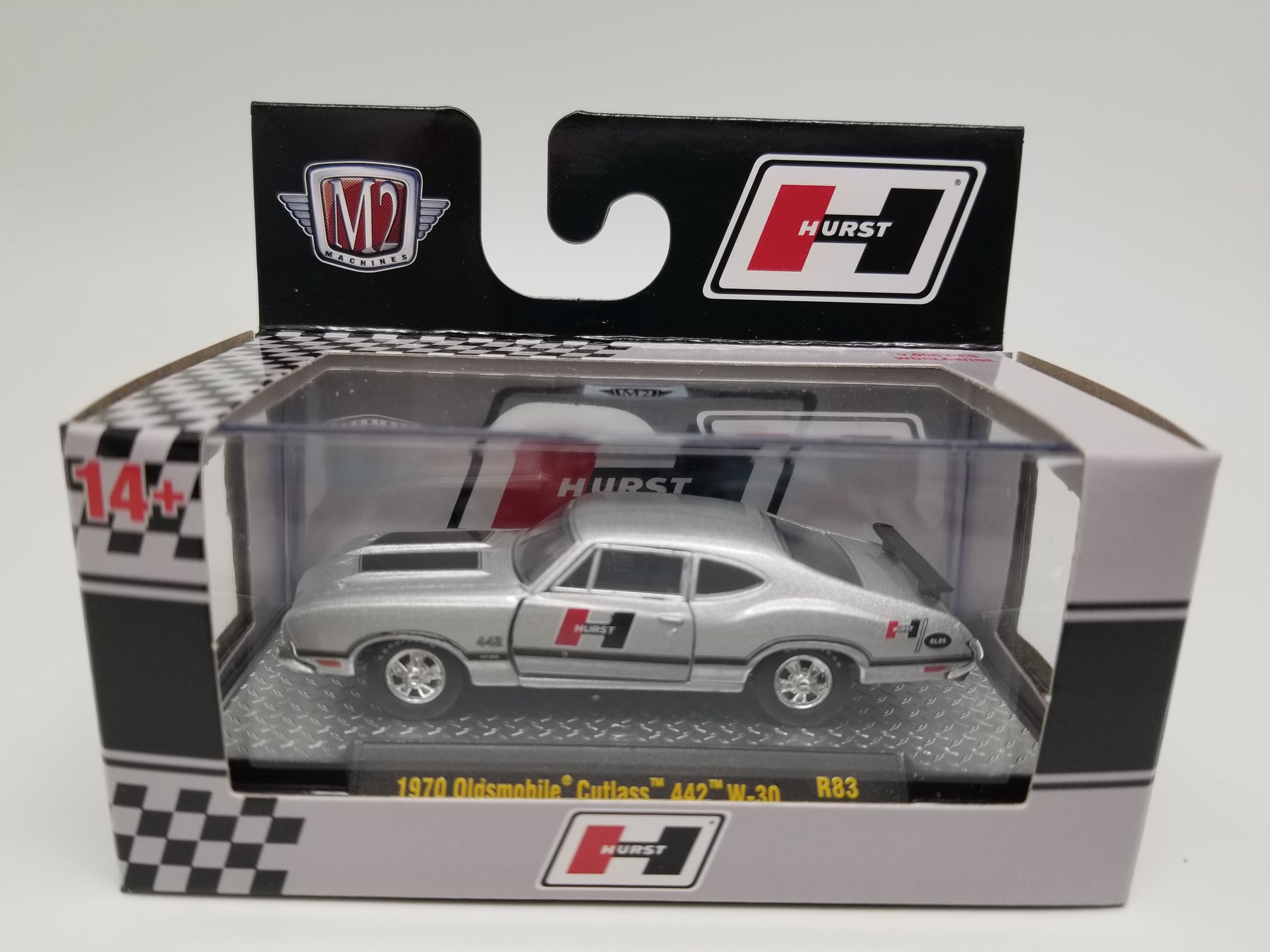 M2 1970 Oldsmobile Cutlass 442 W-30 - Hurst new in package, 1:64 scale.