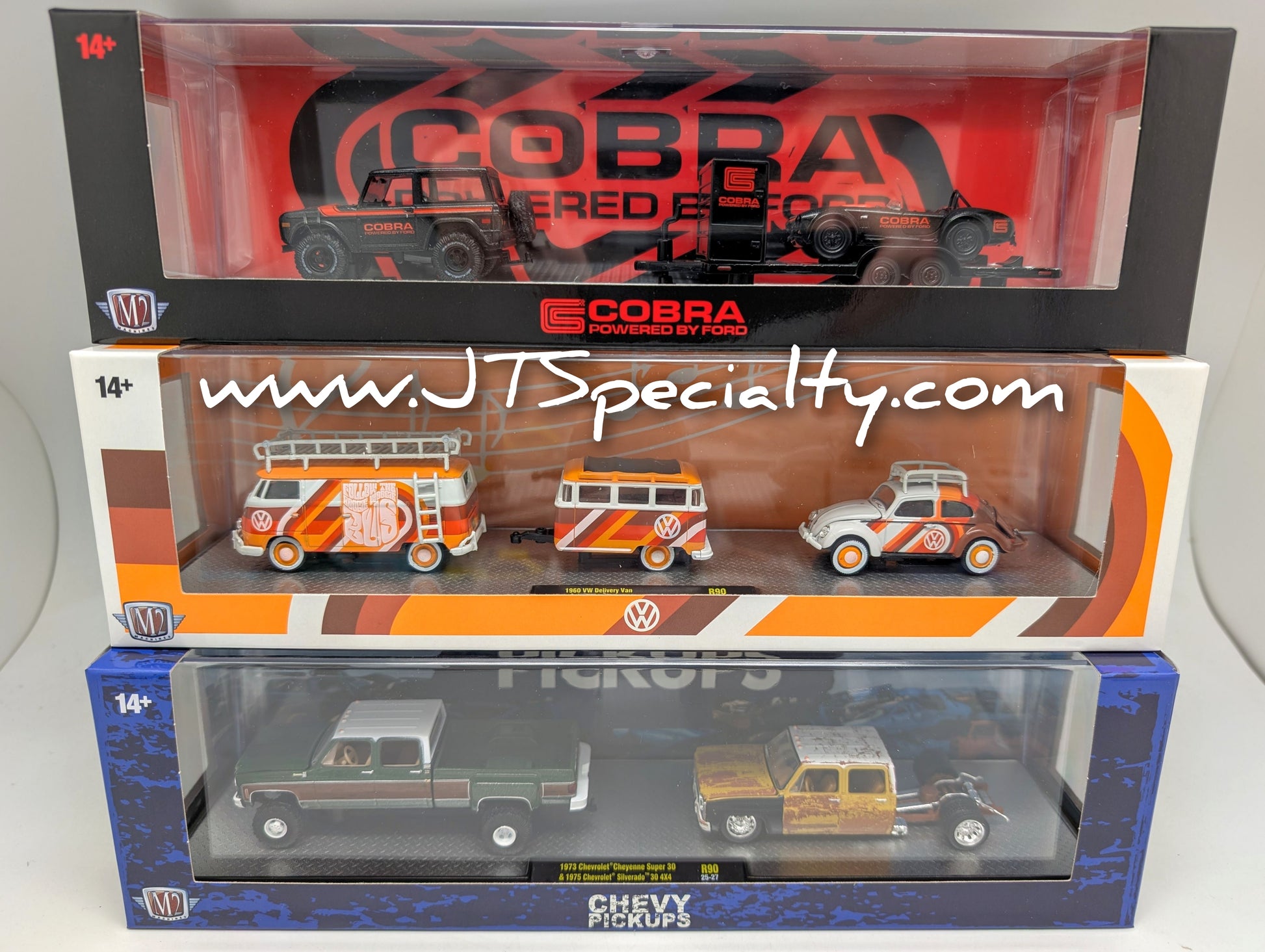 Includes 1 each: 1976 Ford Bronco & 1965 Shelby 427 Cobra, 1973 Chevrolet Cheyenne Super 30 & 1975 Chevrolet Silverado 30 4X4, 1960 VW Delivery Van & 1953 VW Beetle