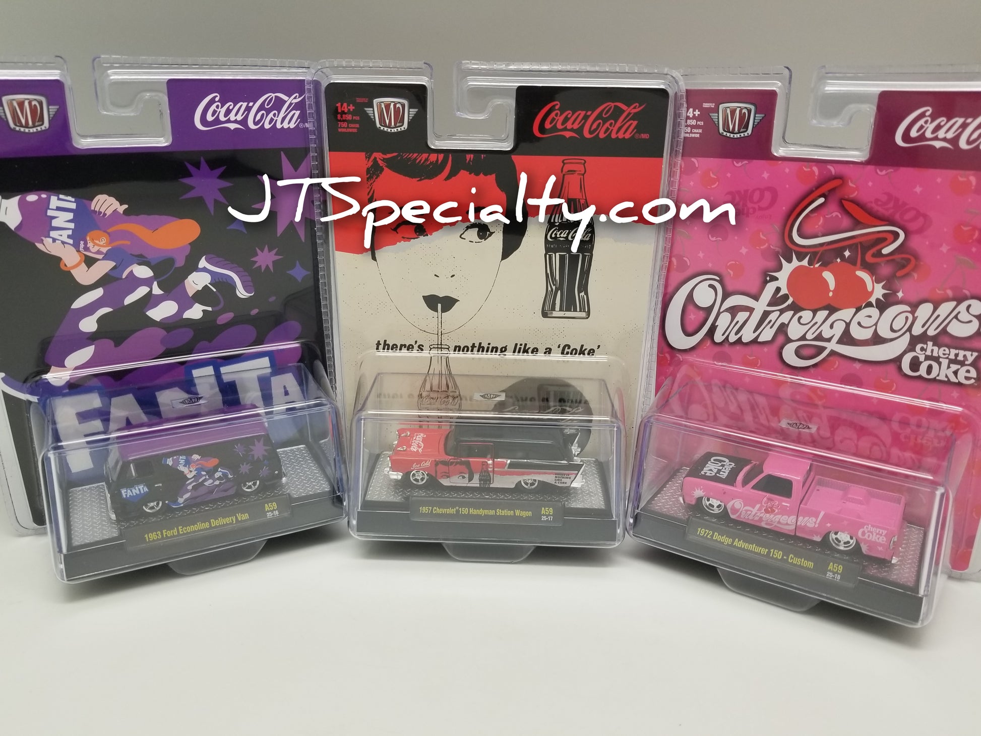 SET of 3 - Includes one of each - 1957 Chevrolet 150 Handyman Station Wagon – Coca-Cola, 1963 Ford Econoline Delivery Van – Fanta, 1972 Dodge Adventurer 150 Custom – Cherry Coke