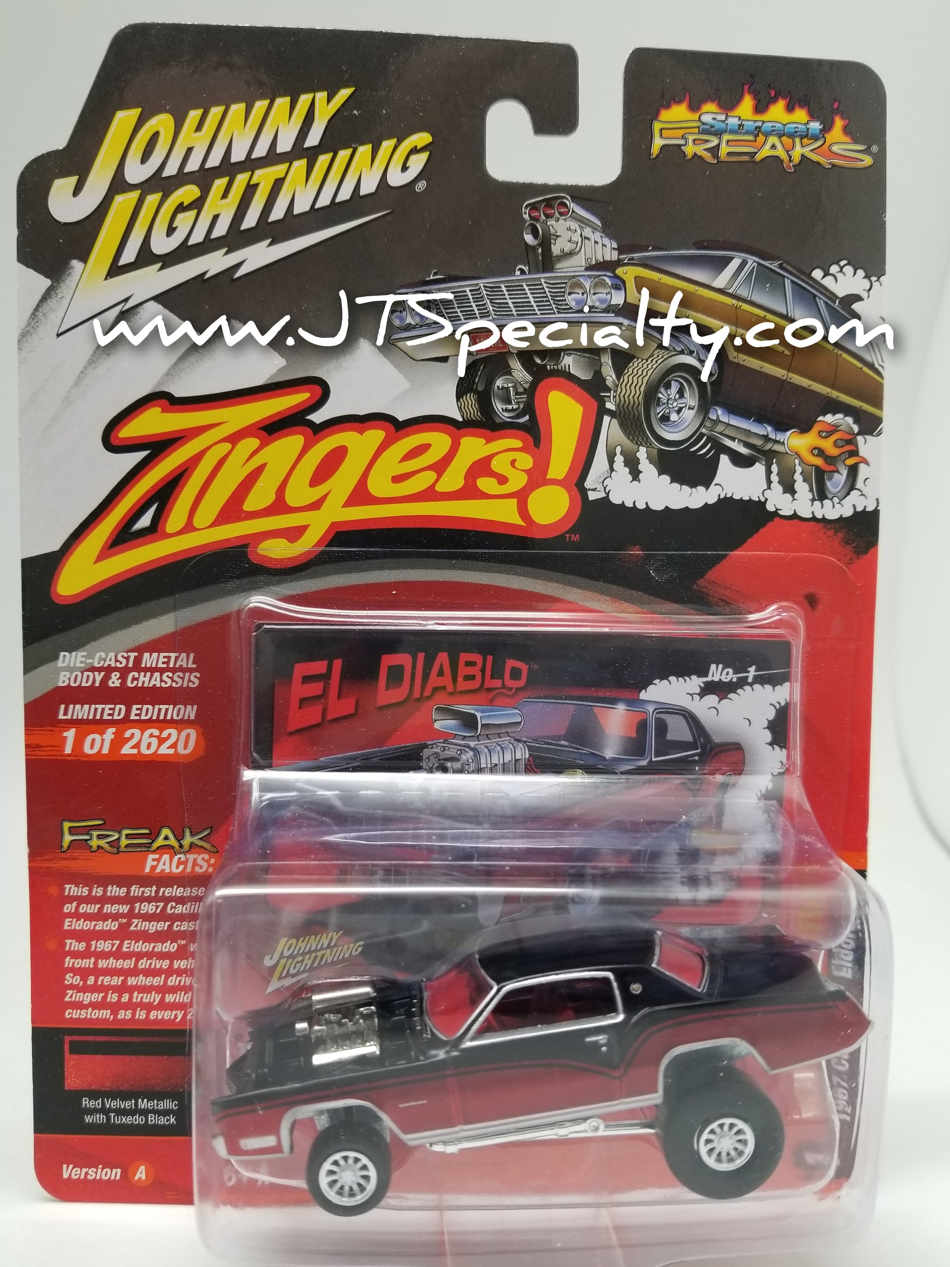 JL Street Freaks ZINGERS! 1967 Cadillac Eldorado (Zingers) (Gloss Black Upper Body w/Dark Red). New in package, 1:64 scale.